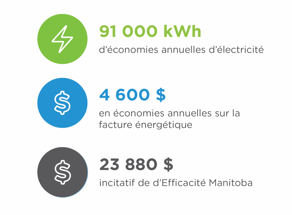 Deerboine Colony devrait économiser plus de 91 000 kWh d’électricité chaque année grâce aux améliorations apportées à l’éclairage. Elle économisera par conséquent près de 4 600 $ tous les ans sur ses factures énergétiques. Nous lui avons également versé un incitatif de 23 880 $ pour les améliorations, ce qui comprend des primes pour la clientèle à plusieurs étapes du projet. Avec les économies d’énergie et les incitatifs, la colonie rentabilisera son investissement en moins de quatre ans.